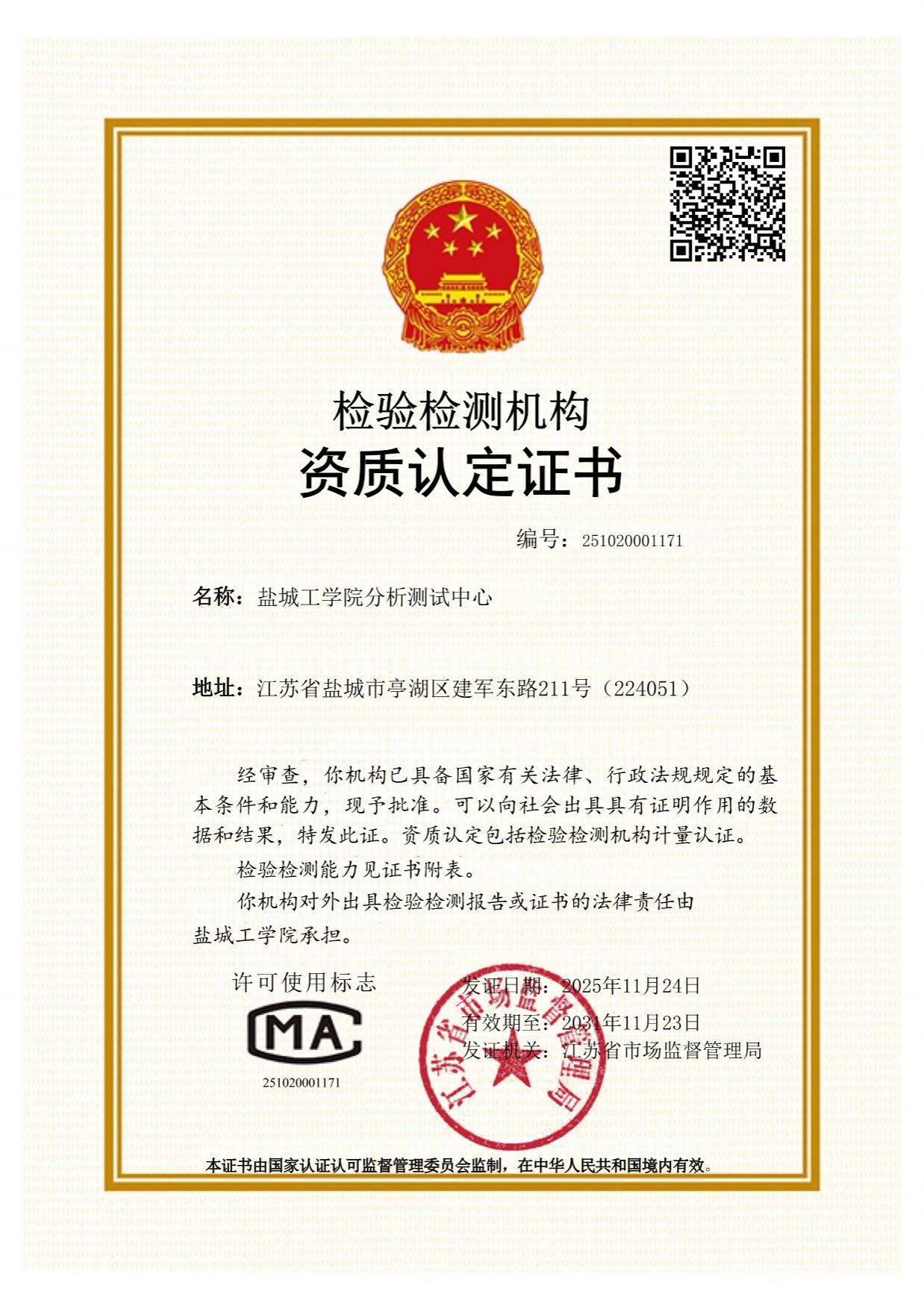 我校分析测试中心2019年取得CMA检测资质,今年12月到期。今年7月起,学校启动了CMA资质复评审工作,经过评审申请、省主管部门在线审核、专家进校现场评审、问题整改等环节,11月24日,我校收到江苏省市场监督管理局颁发的《检验检测机构资质认定证书》(CMA资质认定证书),表明我校顺利通过江苏省检验检测机构资质认定复查换证评审工作,标志着分析测试中心检测能力达到了国家法律和行政法规规定的要求,可以继续面向社会出具具有证明作用的数据和结果。
